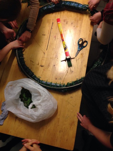 Гирлянду на сухую делать(без оазиса), вплетая пучки цветов и зелени к проволоке или атласной ленте? Либо может оазис, предварительно упакованный в целофан, "зашить" в сетку? И придать брусочкам оазиса, крепко соприкасающимся друг с другом форму венка? Я видела как делали такую гирлянду, правда это была гирлянда с провисом на паникадило;либо круг, сделанный с помощью металлического жгута, для подвешивание на паникадило.Привожу несколько фотографии, найденных в интернете, как изготавливалась основа для круга.