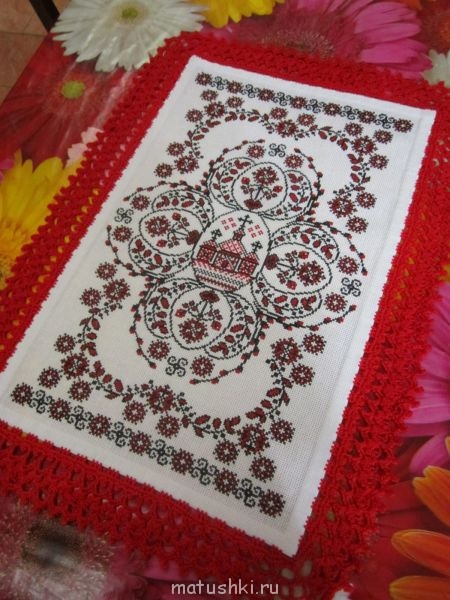 а я бы не стала, потому что это а) банально, б) зрительно расширит салфетку и упростит, а с красным контуром салфетка имеет очень торжественный вид и как-бы возвышается (парит) над алымСиний Чулочек:или обвязку сделать белыми нитками