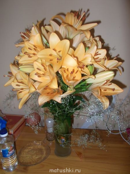 Лилочка, и лилии, и розы, и арбузик , представляю какие при этом запахи! А мне муж прошлым летом подарил лилию, на которой было...47 бутонов на одной ветке! Такого никогда не видела даже моя мама, цветовод со стажем