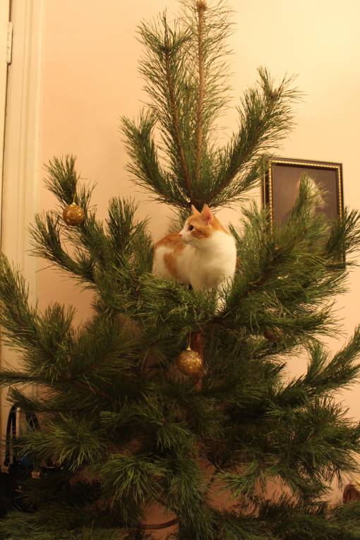 Jane, какая смелая кошечка! Наш борзый котейка пытался веточками поиграть, да укололся так, что теперь только мимо пробегает - быстро быстро! Муж очень удивлен, что елочка наша еще не валялась