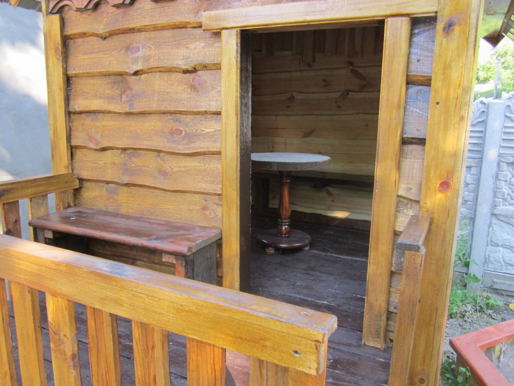 У нас во дворе лет шесть простоял маленький домик, сделанный мужем, домик устарел и решили заменить его новым. Основу сделали за два дня (муж и еще один знакомый-плотник) Остальное батюшка сам доделывал + скамеечки и столик. Размер домика 1.50*1.50, вместе с террасой 1.50*2.30. Внутри муж стоит в полный рост, помещаются четверо взрослых людей.
