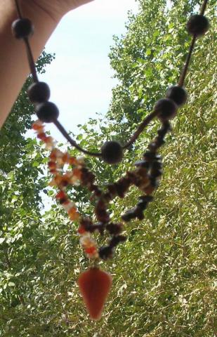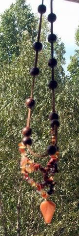 Вот, например, необычное колье на замшевом шнуре. Листик сердолика, крошка сердолик, рыжий авантюрин, тигровый глаз, деревянные бусины. Фотки только неудачные