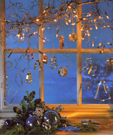 Вариант украшения окна - сухая ветка с гирляндой и формочки для печенья в качестве подвесок.