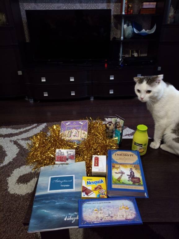 Тетрадь для записей Айвазовский, ладан, шоколад тюменский и маленькие шоколадки Нестлик.