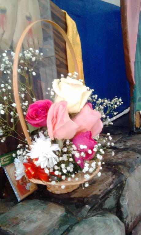 Кстати, с "оазисом" я тоже поработала, (тоже первый раз) сделал вот такую корзиночку к распятию. Розы мне отдали в нашем магазинчике бесплатно, т.к. они были уже полуживые, объяснили как их можно слегка реанимировать, и вот получилось
