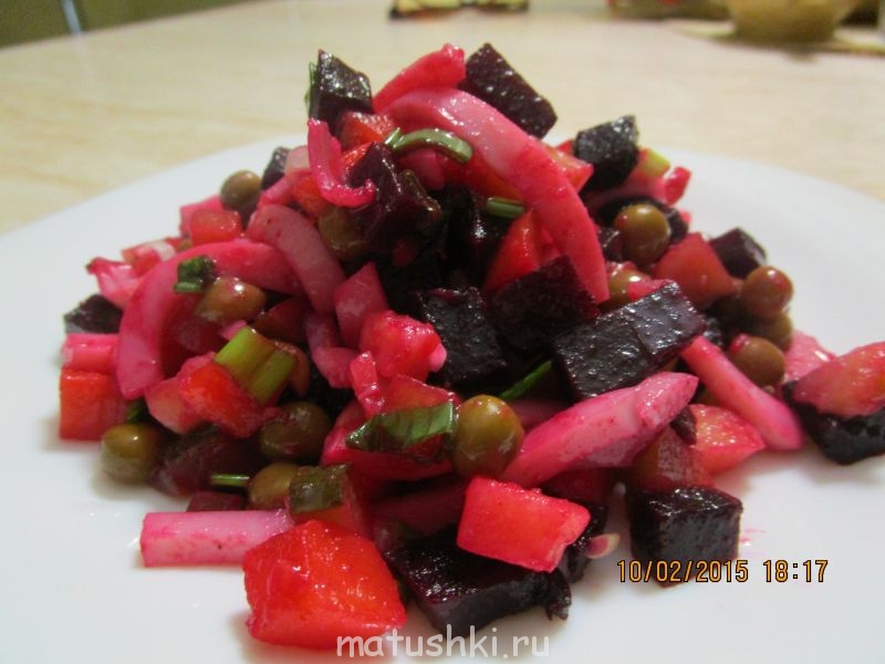 Винегрет с кальмарами тоже очень вкусно. Собственно, в винегрет можно класть много чего, но вот из постного, кальмары просто замечательно, и по вкусу и по цене. Кальмары готовлю так: ополаскиваю тушку, затем опускаю в кипящую воду, как только вода закипит, отсчитываю 15 секунд и достаю. Чищу от кожицы, и обязательно снимаю тоненькую белую пленочку. Иногда она снимается прямо пластом, иногда приходится потренироваться)) А дальше все, как всегда. Нарезаю свеклу в отдельную мисочку, чуть мешаю её с растительным маслом. Все остальные составляющие режу кубиками, затем добавляю горошек, свеклу и нарезанный соломкой кальмар. Солю, немного перца, растительное масло, перемешиваю. Вот и ужин готов))