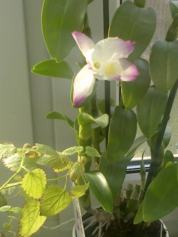 У меня есть орхидея переходная по высоте между мини- фаленопсисом и орхидеей с высоким цветоносом. Я ее купила год назад, или 10 месяцев(точно не помню уже), так она только сейчас впервые готовиться цвести в домашних условиях с новым цветоносом, зато у нее размах воздушных корней почти как размах листьев, много листвы.