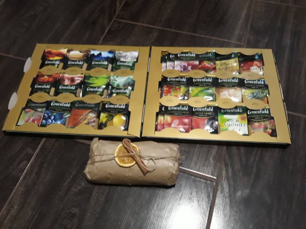 Самым последним раскрыла свой кулек, там такая очаровательная чайная барышня, и не с пустыми руками , а с самым любимым чаем гринфилд с мастихинами и штолленом ( интересно попробовать чужой штоллен), тут мой взгляд падает на коробку "конфет", думаю надо же конфеты гринфилд, потом присматриваюсь, а это набор разных чаев в пакетиках ( срочно нужен смайл с падающей в обморок мышкой).