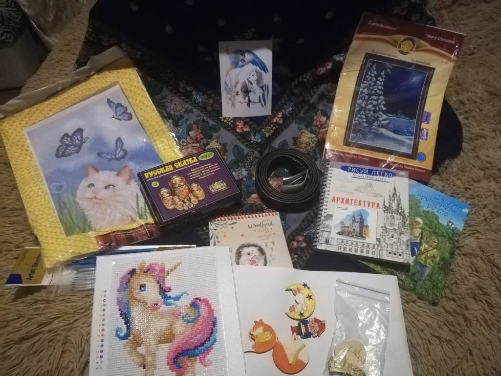 Несмотря на то, что мы не участвовали в акции, мы тоже получили посылку от нашей Снегурочки. Сфотографировать сразу не получилось, а сейчас уже и не соберу всё вместе. Но подарок у нее получился очень творчески ориентированный, за что ей большое спасибо. У нас теперь есть акриловые краски, разные кисточки для росписи, книжка для рисования, заготовки деревянные для раскрашивания (уже почти раскрашенные), алмазная вышивка (уже собранная). Также там было несколько вещей лично для меня. Неожиданный и очень приятный получился сюрприз под Рождество. Решила сказать ей спасибо ещё и здесь