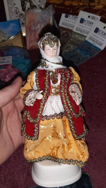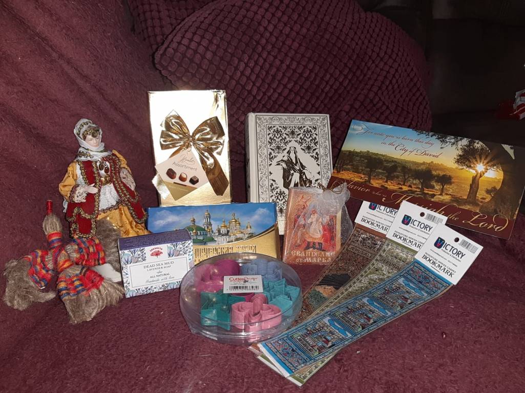 Моей снегурочкой оказалась Наташа-Сената. Уже во второй раз радует нас дорогая Наташенька подарками со Святой земли. В этот раз мое сердце покорила фарфоровая куколка в местном одеянии (подозреваю, что это иудейское одеяние или арабское?), прекрасное издание в ориентальном стиле с золотым обрезом "Энциклопедия мудрости" с изречениями мудрецов, начиная от царя Соломона, миниатюрное Евангелие от Марка, чудесные гобеленовые закладки также в восточном стиле с изображениями Иерусалима, ангелочек, сплетеный из сурового жгута (Наташа, расскажи о нем?), кофетки, шоколадка из Киево-Печерской лавры, формочки для вырезания печенья и лавандовое мыло (мой любимый аромат, могу вдыхать бесконечно!). Открытка с видом на Иерусалим.