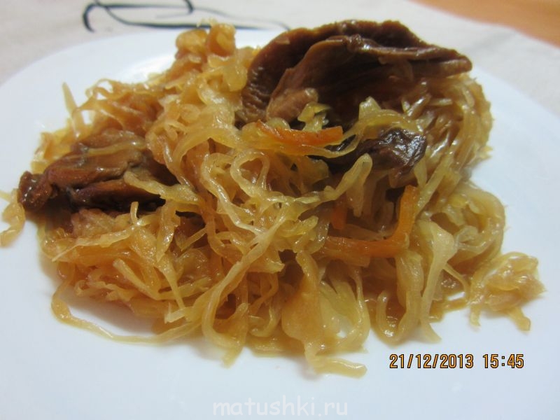 Квашеная капуста, тушеная с сухими грибами. Вкусно. И не важно в какой мульте))