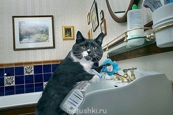 14. Кот должен сам время от времени устраивать влажную уборку в доме. Для этого вполне достаточно вытащить из кухонной раковины губку для мытья посуды и, перетащив ее в комнату, разорвать на мелкие части так удобнее сделать уборку.