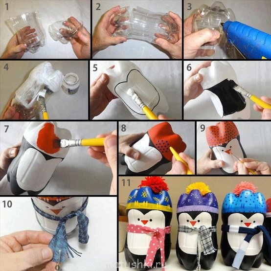 Забавные пингвины из пластиковых бутылок, которыми можно украсить уличную ёлку