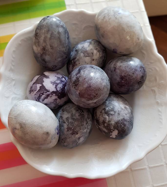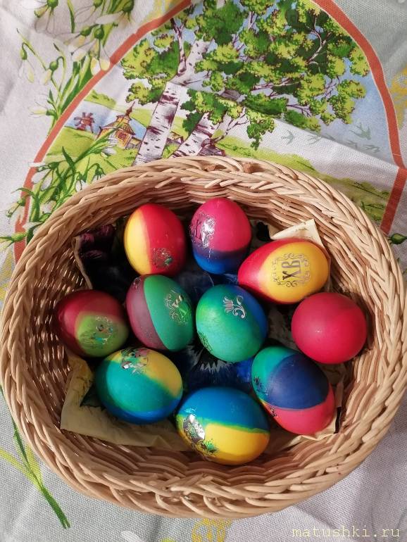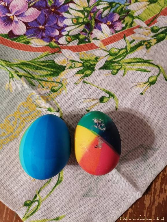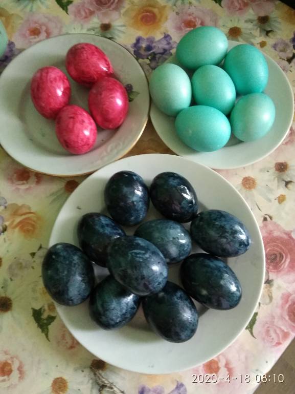 Шелухи не было, зато у меня много пищевых красителей, вот такие фантазийные вышли яйца у нас