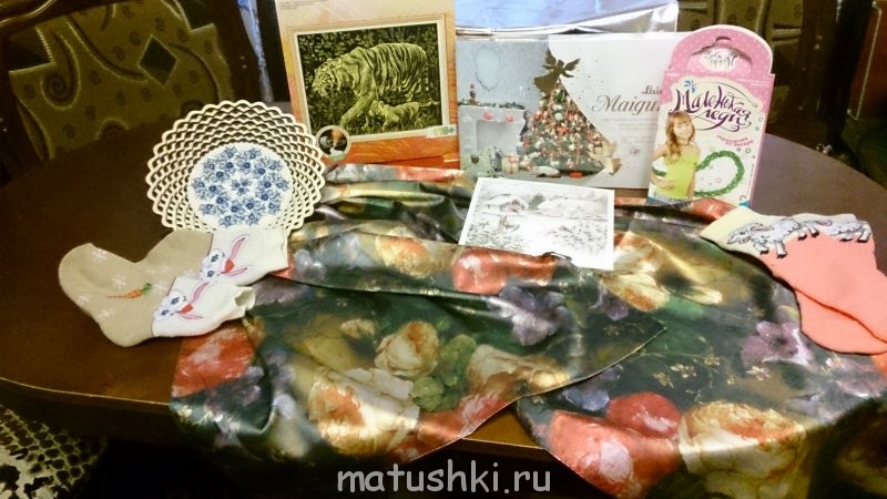 описываю :для деток -набор для бисероплетения,гравюра,классненькие веселенькие носочки для младших.коробочка зефирок в шоколадне( я успела спрятать ),очень оригинальная сухарница и замечательный красивенный,нарядный шарфик!