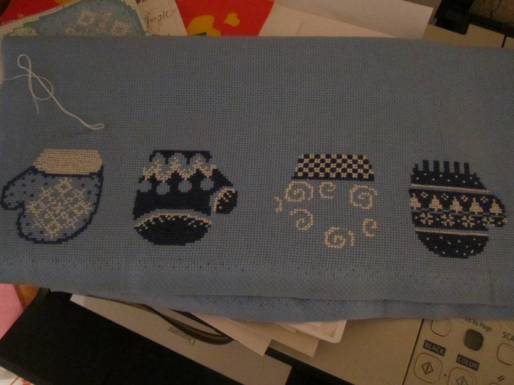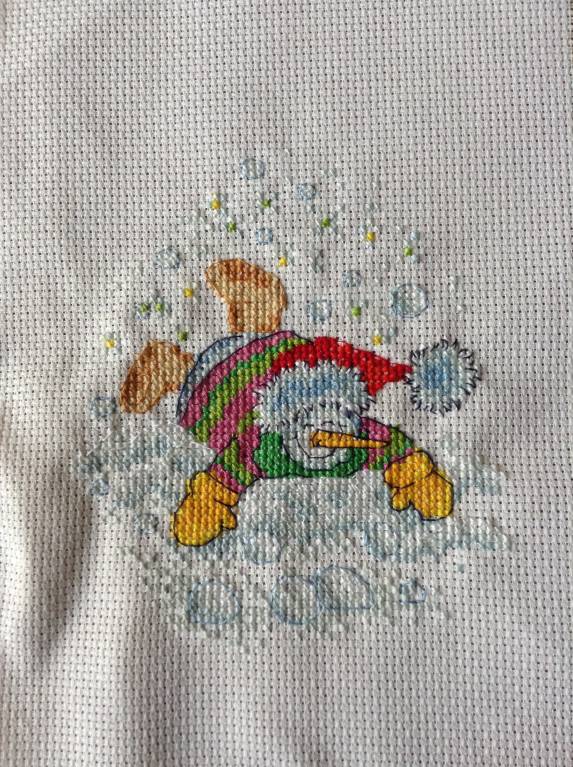 Тореро - 923 крестика Снеговики - 361 крестик + (435 Бэкстич)/2 +363 (2-й снеговик) = 941 крестик Прошу прощение, что показываю мятую канву, я еще не приводила вышивку в цивильный вид.