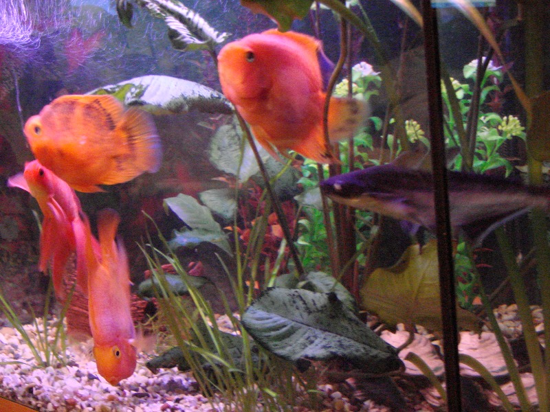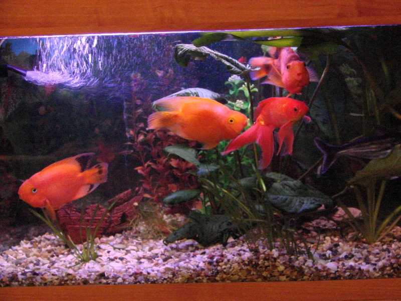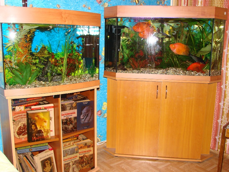 Вот наши аквариумы: маленький - 80 л с гуппешками, большой - 180 л - попугаи, золотая рыбка , акулий сом, парчовый (тигровый) сом, несколько пицелий и кардиналов. В маленьком стоит фильтр AQUAEL, в большом - не видно, когда будем чистить посмотрю.