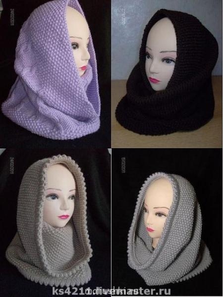 Ева, лет с пятнадцати ношу только такие головные уборы, это называется снуд. Я их всегда вязала сама в разных вариациях, и сейчас в планах очередной. По мерке от подбородка по линии роста волос опять же к подбородку надо набрать петли. Если снуд будет плотно облегать голову под подбородком (как на втором фото), набирать меньше петель, если модель пышная, свободная, как на остальных - больше, по своему усмотрению. Далее вязать узором прямо, без прибавлений и убавлений - хорошо смотрится английская резинка, рисовая вязка, да и просто лицевая гладь. Когда свяжется нужная длина трубы, сшить, и всё. По этому же принципу можно вязать на круговых спицах, чтобы шва не было. Если абстрагироваться от узора - вот ссылка http://ledyrussia.com/152-kak-svyazat-sharf-snud.html