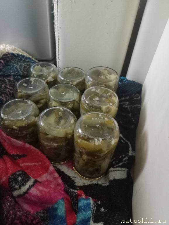 Там баклажаны надо было отварить и поставить на ночь под гнет, потом половинками поджарить и прослаивать по банкам с чесноком, перцем, зеленью.
