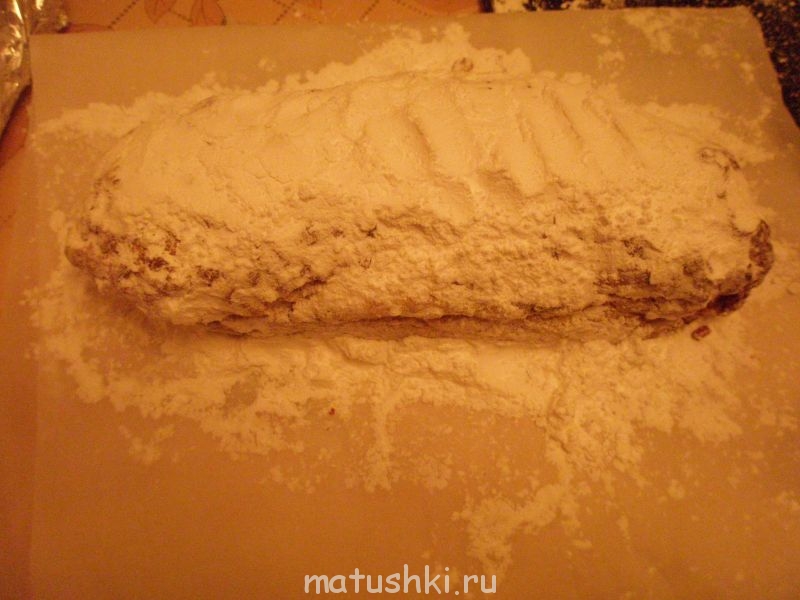 Специй клали мало, т.к. не очень их любим, боялись переложить. А еще после того как все приготовили, отключили электричество, хорошо, что успели испечь, полить маслом и обсыпать пудрой. Убрали штоллены на лоджию. Вот что получилось: