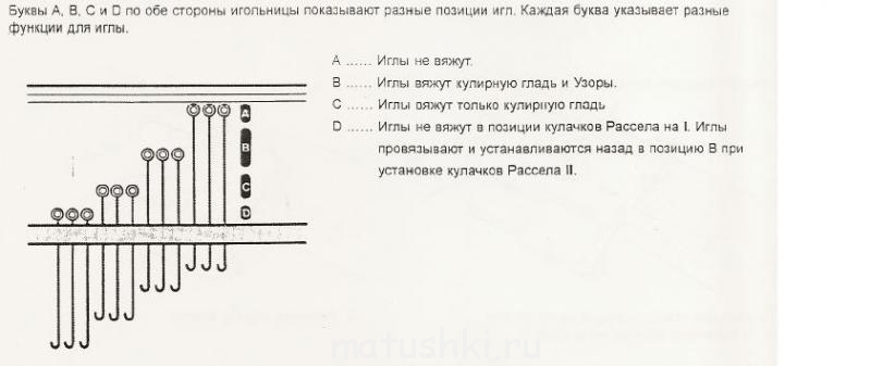 Не, так не получится! Тогда для толстых ниток будет так: 1х1 в пол. В, потом 1х3 в пол. D, набор 1 ряда. Дальше иглы стоят уже через одну и можно вязать.Верона:5. Не выдвигая оставленных в заднем крайнем положении игл (для данной пряжи), привешиваем грузики и продолжаем вязать.