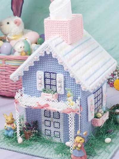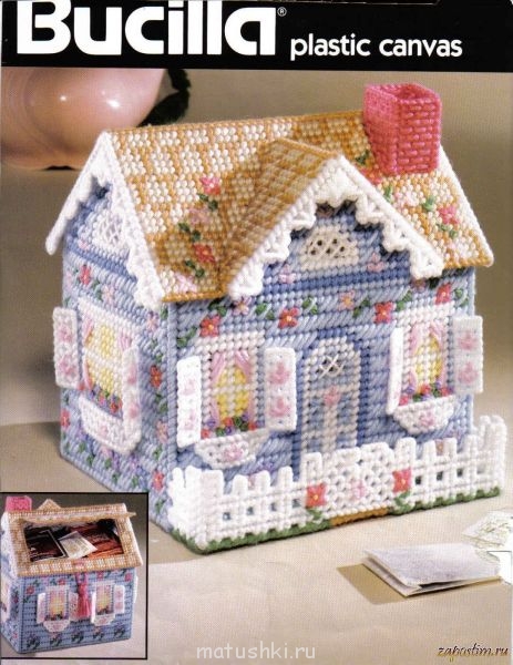 Домики - это вышивка по пластиковой канве (на картинке написано plastic canvas). Из нее и мебель для кукол делать можно, и дома.