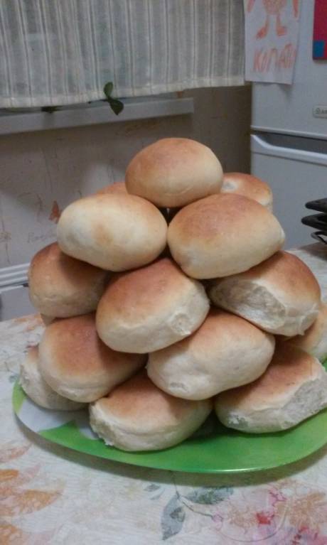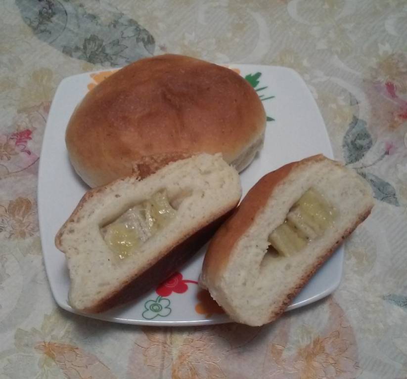 А у нас сегодня булочки с бананом, 2 полных противня. Тесто получилось отличное, к рукам не липнет совершенно, эластичное, подялось хорошо.