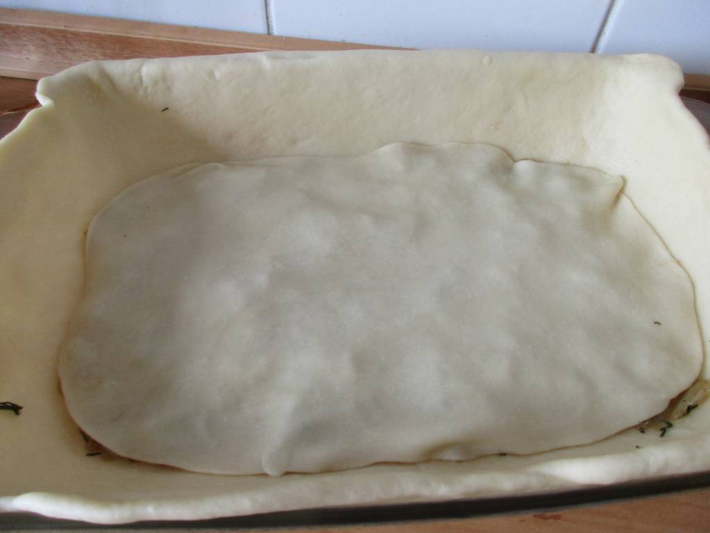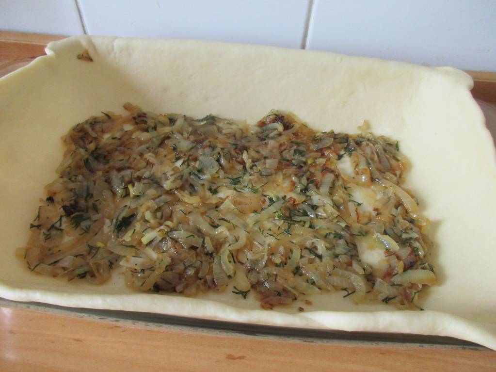 Форму смазать растительным маслом, тесто разделить на 6 частей. Одна часть должна быть больше остальных. Раскатать тонко большой кусок теста и выложить в форму так, что бы края свисали. На дно выложить равномерно 1/4 часть жаренного лука, накрыть тонко раскатанным пластом теста, затем опять лук и тесто, а результате должно получиться 4 слоя лука, верх закрыть тестом. Защипать края, украсить остатками теста, смазать поверхность пирога тонким слоем растительного масла и выпекать пирог 30 минут в заранее разогретой до 190 градусом духовке. Форма у меня стеклянная, размер 25*35