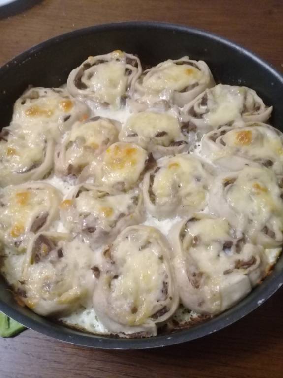 Второй рулет имел начинку из ранее приготовленных и не съеденных куриных желудков. Эти рулетики сложила в форму, посылала сыром ( нашла в углу холодильника, заветренный немного), и залила яйцом+молоко. И отправила в духовку.