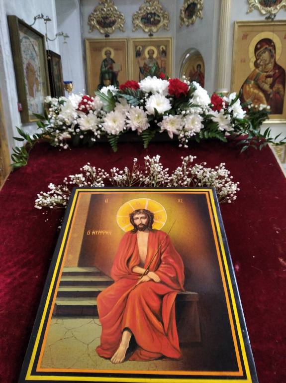 У нас маленькая и старенькая плащаница. Последние годы я не делаю к ней венок - даже самое компактное оформление закрывает почти всё изображение. Готовлю небольшую композицию на оазисе. В этом году из хризантем, гиацинтов и маленьких роз. Положение спасли зелень и гипсофила. От гиацинтов потрясающий запах, можно было даже не умащивать плащаницу