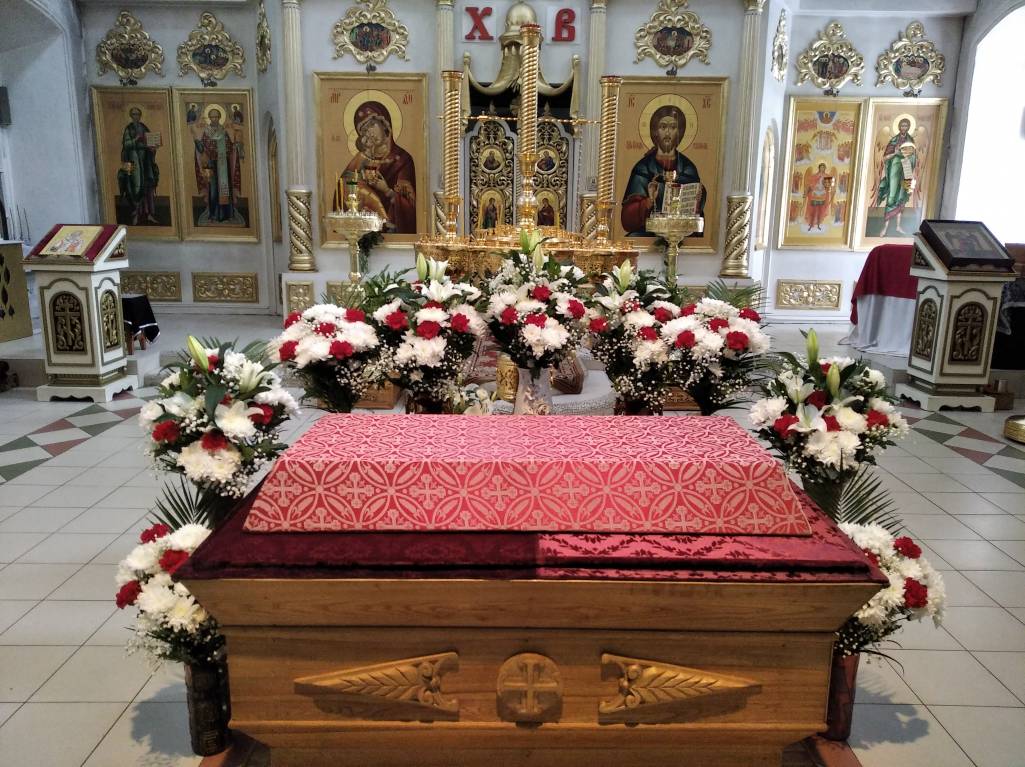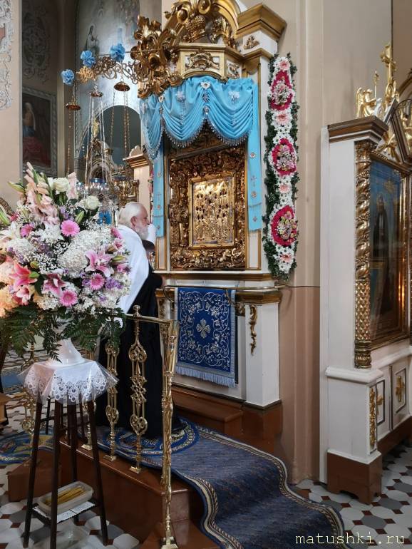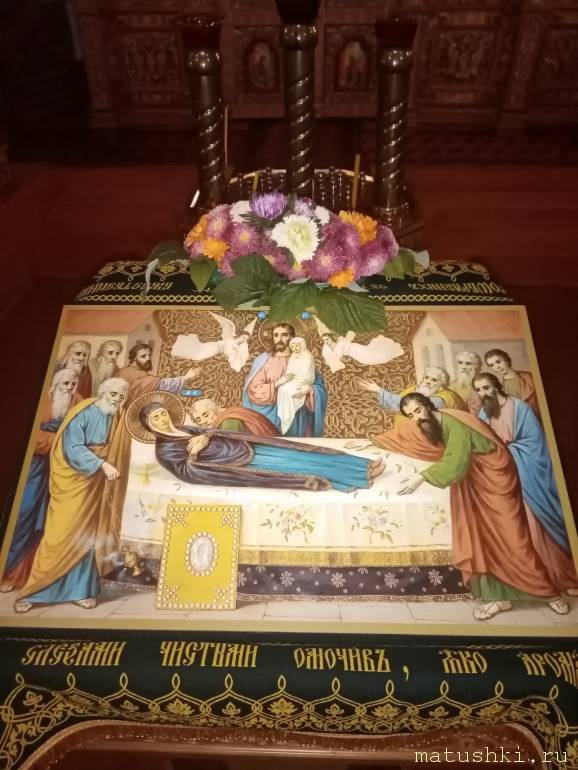 У нас сегодня вот так! Цветы все принесли прихожане со своих участков, в основном астры и гладиолусы, у кого что выросло. Вот выбрали для иконы, остальные в вазах стоят!!!
