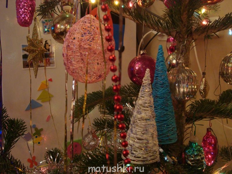 Агриппина, основа - воздушный шарик, самый маленький. У елок - картонный конус, обклеенный скотчем. Чтобы легко потом снялся, когда нитки высохнут. Нити пропитываю в клее ПВА через стаканчик от йогурта или мороженного. Можно обычный пластмассовый одноразовый стаканчик взять. Практически у самого дна стакана делаю шилом две дырки - одна напротив другой (примерно). Вставляю нить и протягиваю через обе дырки. Получается заходит нить сухая в стакан, выходит уже в клею. Наматываю в любом порядке. Клей когда высыхает, то становится невидимым. За ночь все это высыхает, потрескивает бывает. Это шарик отлепляется от нитей. Утром дочка прокалывает шарик иглой и через любую дырочку вытаскиваем остатки надувного шара.