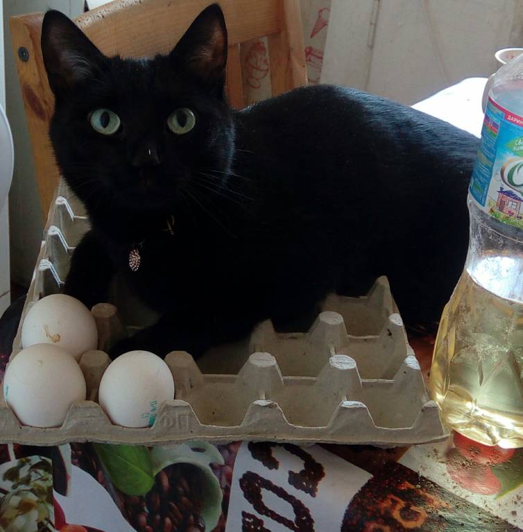 Собралась я испечь шарлотку. Достала из холодильника яйца и отлучилась буквально на минутку. А помощничек тут как тут, смотрит на меня ласковым взглядом. Люблю его очень.