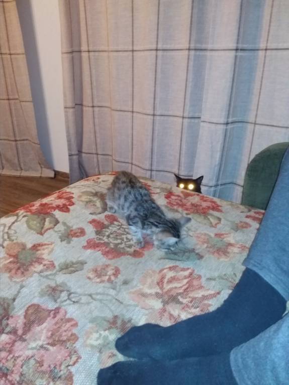 вместе носятся как лошадки,играют.Муся,наша первая кошка бывает ревнует новенькую и борется с ней в порыве ревности,но не совсем всерьёз,а как бы в воспитательных целях.Даже в лоток один ходить стали.