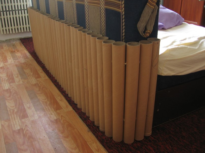 Это конструкция из соединённых, как бы сшитых между собой, трубочек. Наподобие таких, на которых т/бумага или бум. полотенца, но эти трубочки не высокие и мебель они вряд ли спасут. Мне кажется взяты трубочки от пищевой плёнки. Но можно и с трубочками от полотенец попробовать.