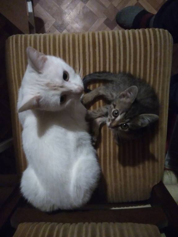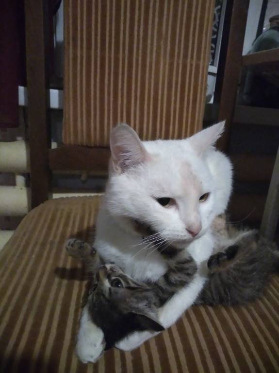 Такой вот кошачий детёныш подобрыш, нашла наша собака,носом ткнулась в темноте подъезда,я еле разобрала что там.Месяц назад, вообще молекула была,до сих пор мамку ищет,одеяло сосёт или одежду