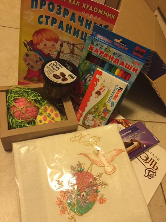 - не меньше килограмма самых разнообразных сладостей (Ирина, ты как догадалась, что я люблю марципан?!:)). Позвала мужа смотреть, я-то до Пасхи их есть пока не буду, вот марципан, пожалуй, припрячу до разговения:);