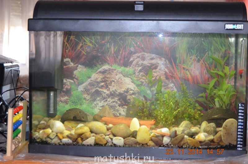 Миропия, очень симпатично получилось))). Только растений маловато. Может быть вспышка водорослей. Напиши, какие у тебя растюхи и какой свет. Постарайся раздобыть роголистник. Мох самый простой - яванский конечно. Берешь его пучек. Достаешь свой кокос, распределяешь мох равномерно по его поверхности, а сверху аккуратно надеваешь сеточку, в которой чеснок продается. Мох прорастет через ячейки и покроет кокос пушистой шапкой. Главное, чтобы водоросли не полезли.