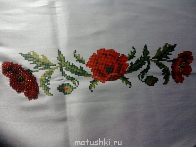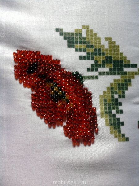 Заказала 4 заготовки, решила вышивать "на будущее", пока заказов нет, какая разница на заказ или уже вышитую продавать? Также заказала бисер. Всех цветов указаных в заготовке не подобрать, заказывала на угад. Попробовала вышить с подобраным мной бисером (если честно то думала что будет сочетание не очень), а получилось очень даже ничего (вышила в суботу поздно вечером один цветочек). А вышиванка еще и скрасными маками, так там вообще... (красота получилась