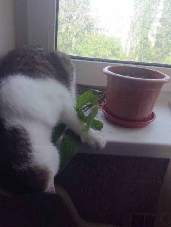 Застигнут на совершении хулиганства. Крадет мой цветок прямо с горшка.