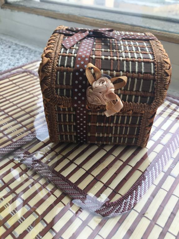 Когда я открыла коробку, первым делом увидела соломенный коврик под горячее - спасибо, очень кстати, мне есть куда его постелить:). В тон к нему две очаровательные прихватки - у меня на кухне как раз нет ни одной и все время проблема, чем вытащить тарелку из микроволновки:). Шкатулочка из бамбука (?), я догадалась в неё заглянуть и обнаружила в ней милого пасхального цыплёночка и чашечку для святой воды.