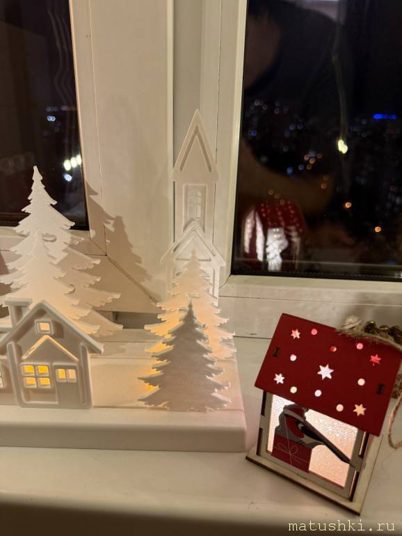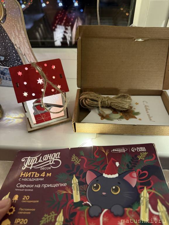 . Чудесный фонарик с Кремлем и снегирем (я писала в анкете, что люблю снегирей), гирлянда из флажков и свечи на прищепках, которые точно пойдут в дело! А я ведь не выкладывала еще на форуме, что у меня в этом году окно оформлено с разными видами освещения, и новый элемент отлично в него вписался.