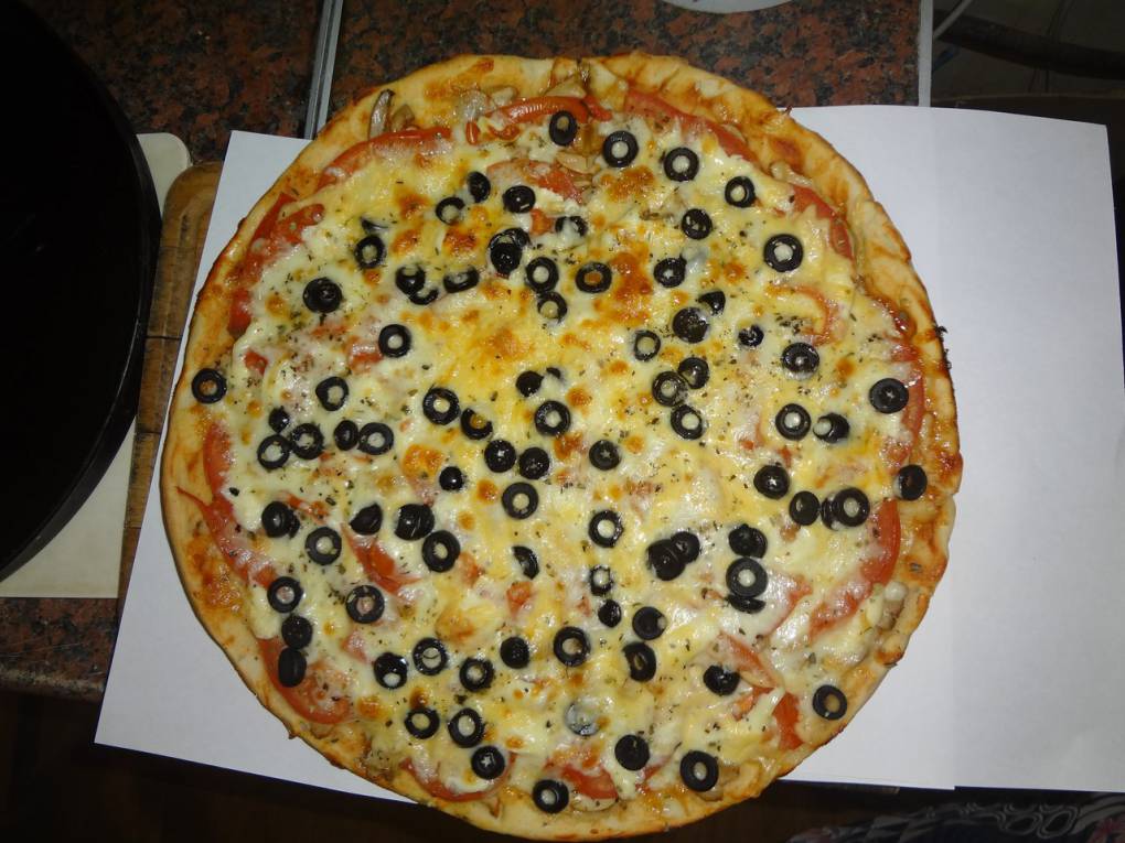 Вариант вегетарианской пиццы от мужа (в нашей семье он по пицце главный). Из ингредиентов: сыр моцарелла, помидоры, маслины, шампиньоны. Основа смазывалась томатной пастой.