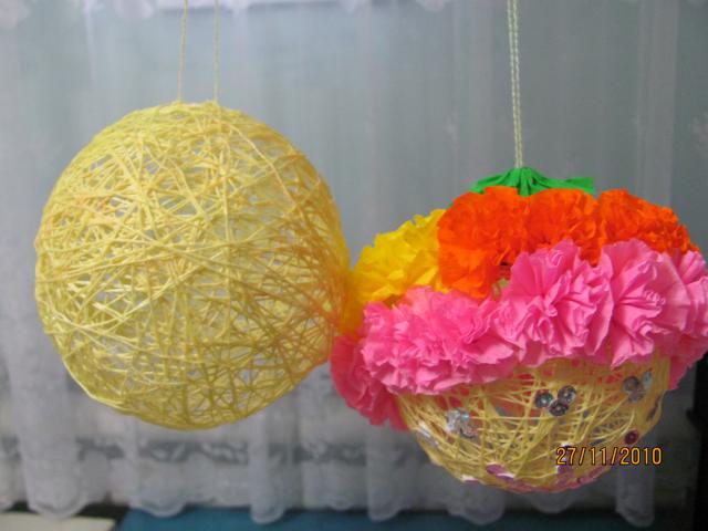 Можно что-нибудь на ниточный шарик наклеить - разные интересности получаются, но как показывает мой опыт клеить лучше пока шарик-основа надут, иначе ниточный каркас может помяться.