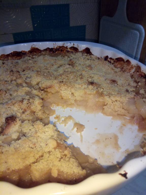 так как мед дает в сочетании с фруктами очень много сладости, но это нужно подбирать только по своему вкусу. Довольно быстр в приготовлении, не требует большого количества продуктов, начинка может быть разной. Давидка воротивший нос от запеченого яблока умял 2 порции крамбла и повел меня за еще одно