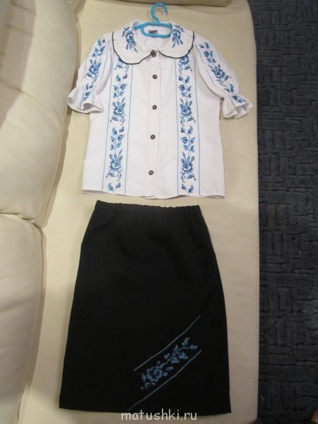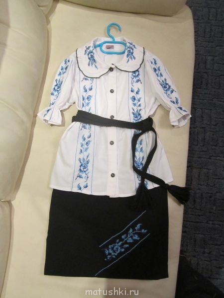 Блузку взяла у старшей (отпорола кружева, нашила сетку и вышила), а юбку пошила из габардина (развернула рисунок под углом), а пояс одолжили у папы