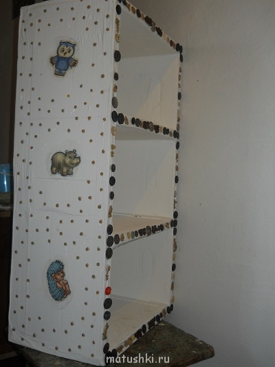 Склеила коробки- нагрузку выдерживали не более 14кг, покрасила белой матовой акриловой краской для стен, наклеила картинки, пуговки, зерна кофе и чечевицу. Снова покрыла все белой краской(кроме картинок). После 2 слоя морилки(1 слой не понравился цвет) и под конец матовым лаком для дерева. Сейчас нагрузку выдерживает 20кг.