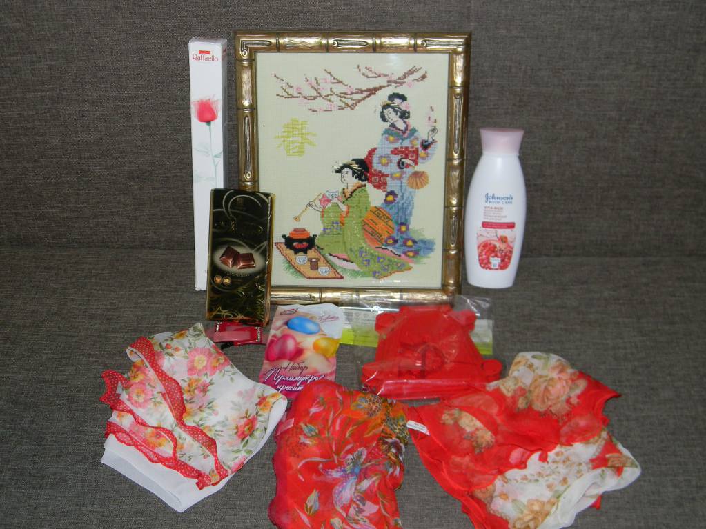 Каждой прилетело по платочку! Гель для душа, заколочки и большая красивая вышивка!!! И письмо с запахом духов! Теперь от моих рук пахнет розами и во всей комнате стоит их тонкий аромат... Так здорово... Очень-очень люблю натуральные цветочные запахи... Сонечка, радость моя, спасибо тебе!!!
