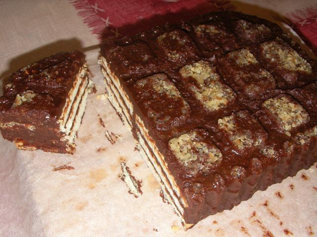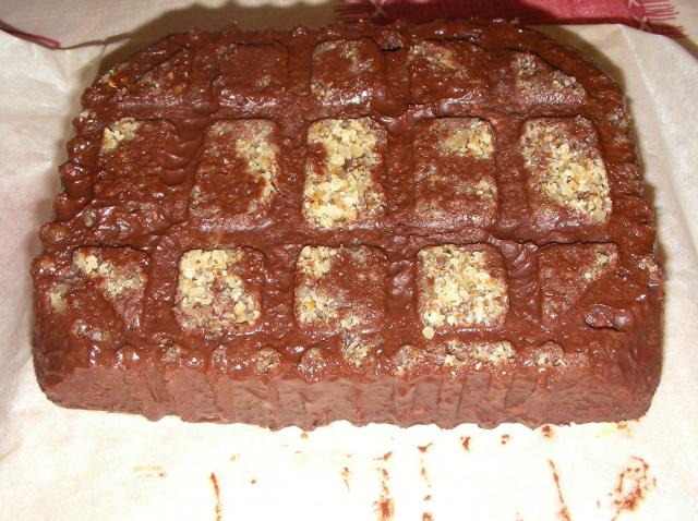 Берем форму (можно пластиковый контейнер,можно проложить фольгу) насыпаем чась молотых орехов.Наливаем порцию шоколадной смеси.Выкладываем слой печенья.Заливаем порцией шоколадной смеси.Опять - печенье.Опять шоколад. и т.д.Убрать в холодильник часа на 3-4.
