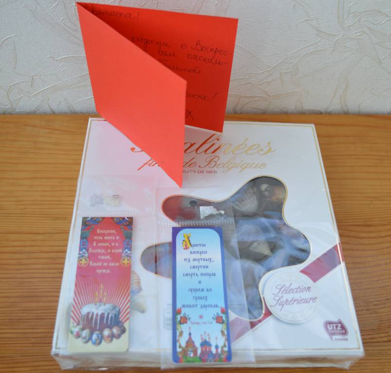 Вот такие уютные подарки (коробку вкусных конфет, две пасхальные закладочки и открытку с теплыми поздравлениями) мы получили! Одну из закладочек (красненькую) я уже себе заныкала